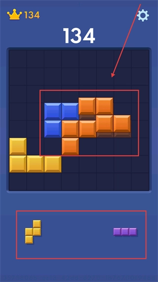1、把方块拖放到8x8的网格里,只要填满一整行或者一整列就能将其消除,要是网格装不下剩下的方块,挑战就会结束。