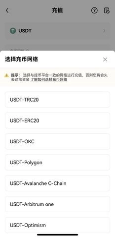 在选择充币网络时,确保其他平台或钱包的【提币/提现网络】与欧易钱包的充值网络保持一致,例如都为USDT-ERC20,否则资产可能会丢失。
