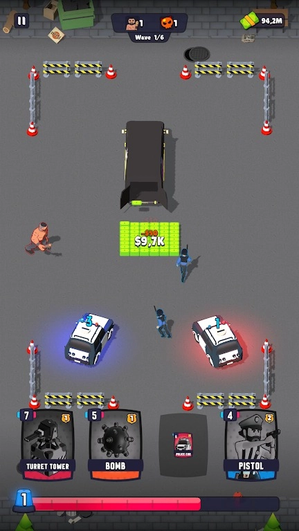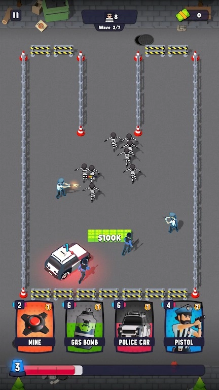 1.以警匪对抗为核心,玩家扮演警方指挥官,通过部署警察、警车、地刺等防御单位,保护己方资金不被匪徒抢夺。