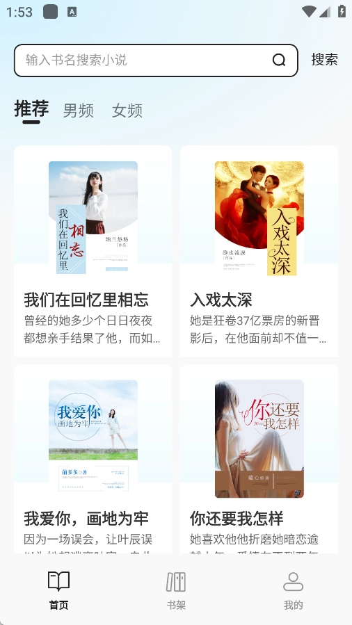1. 首页设有推荐、男频以及女频分类,你能从中挑选心仪的小说。