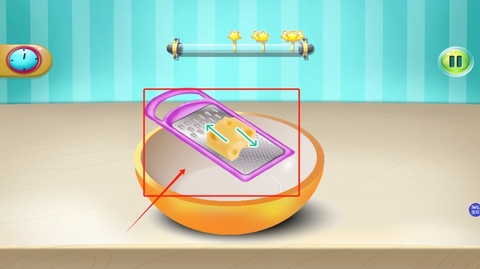 3、按绿色箭头方向滑动,把黄色东西在刨丝器上磨碎。