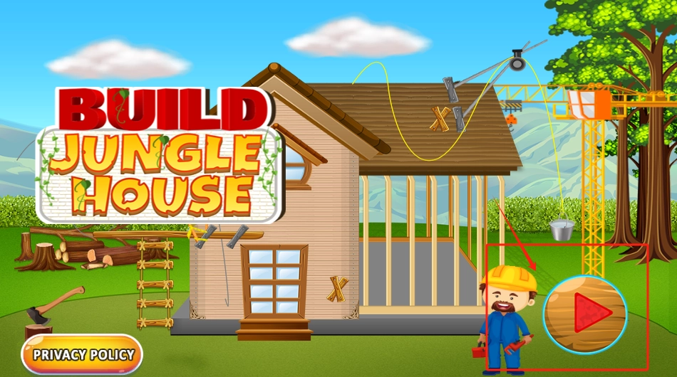 1、点击红箭头所指的播放按钮,头戴安全帽的工人便会着手建造房屋,同时背景中能看到起重机正在作业。