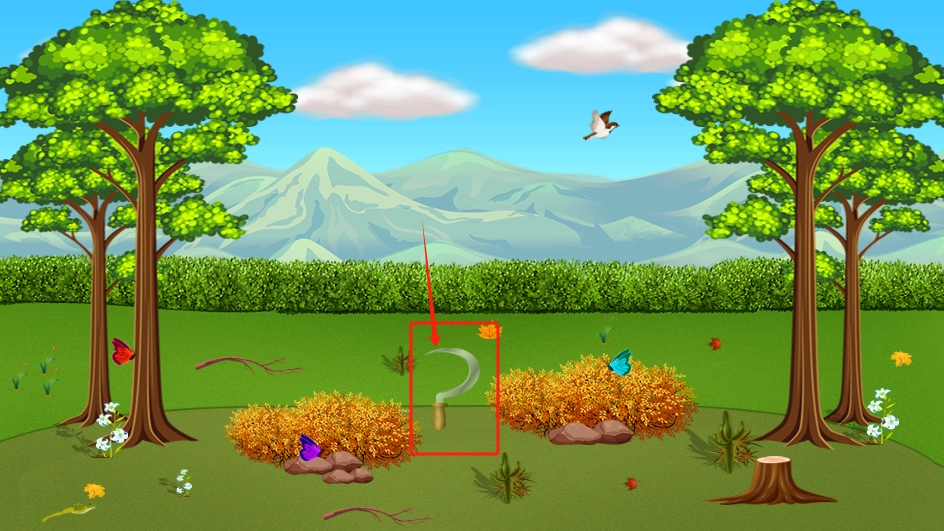 2、看红框里的镰刀,点它就能割草收集材料,旁边有蝴蝶在飞。