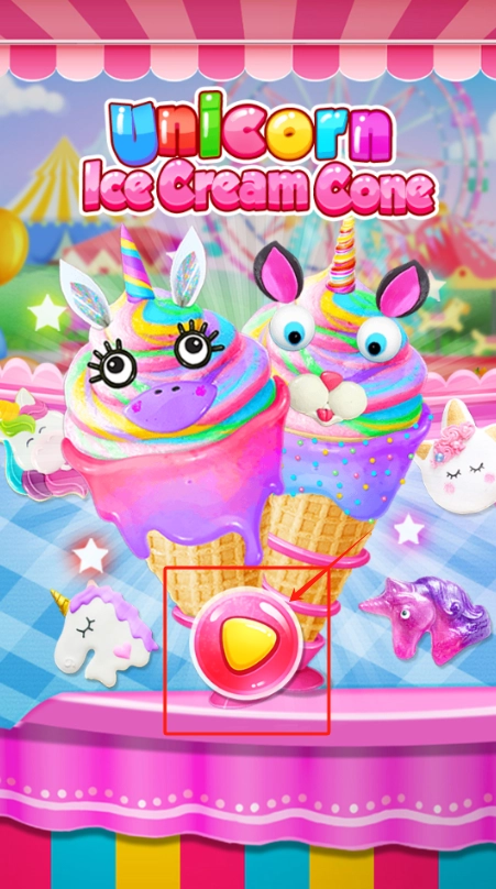 1. 轻点红心按钮开启游戏,运用彩虹配料亲手打造独一无二的独角兽冰淇淋甜筒。