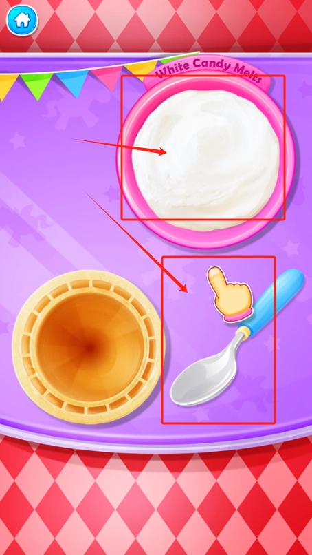 2、拖动勺子舀取白色软糖,倒入模具制作Q弹糖果冰淇淋球。