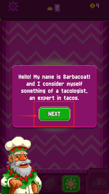 2、听完厨师自我介绍,点绿色NEXT按钮继续游戏。