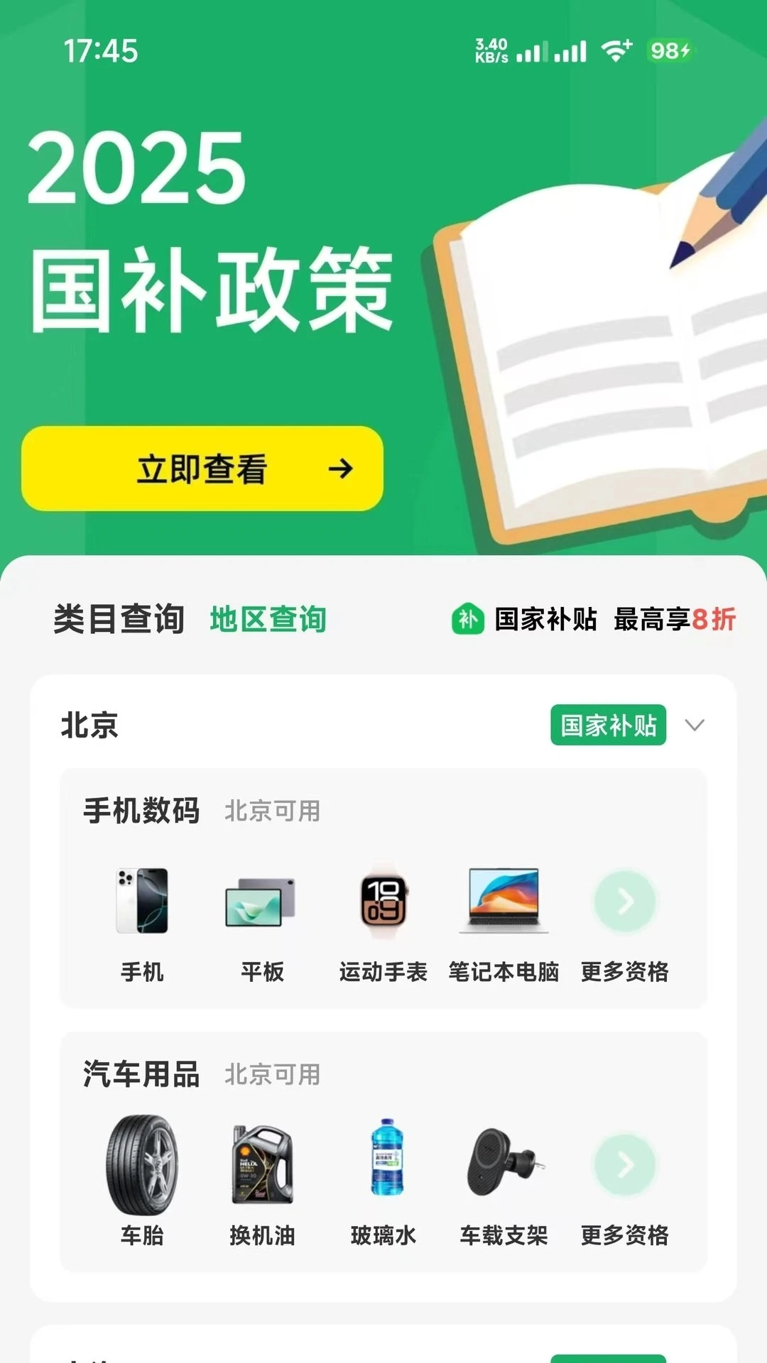 3. 涵盖家电、数码设备、家装家居、农业机械、新能源汽车等众多消费领域,几乎涵盖当下市场上所有国家补贴涉及的商品类别。国补一键查App凭借其强大的功能集成、智能化的服务设计以及对用户隐私的高度关注,成为一款不可多得的惠民工具。它不仅降低了获取国家补贴信息的门槛,还显著提升了政策执行效率,真正实现了“让数据多跑路,让群众少跑腿”的理念。国补一键查,您的补贴查询好助手。支持一站式查看国补政策、国补领取教程及实用文章,助您轻松掌握补贴要领。更有便捷查询通道能够快速查询国补城市,选择你所在的城市,轻松获取国家补贴信息。还能展示各地区支持补贴的品类项目,比如手机数码、家电等品类,帮您快速锁定心仪补贴品类,让补贴查询与生活服务更便捷!