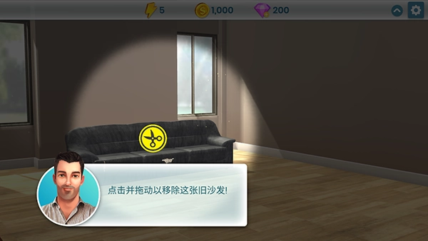 进入游戏后,首先映入眼帘的是一段新手引导。在引导环节,你需要完成一些简单操作来熟悉游戏玩法。当屏幕上出现剪刀图标时,点击它就能开启沙发改造,进入设计界面。