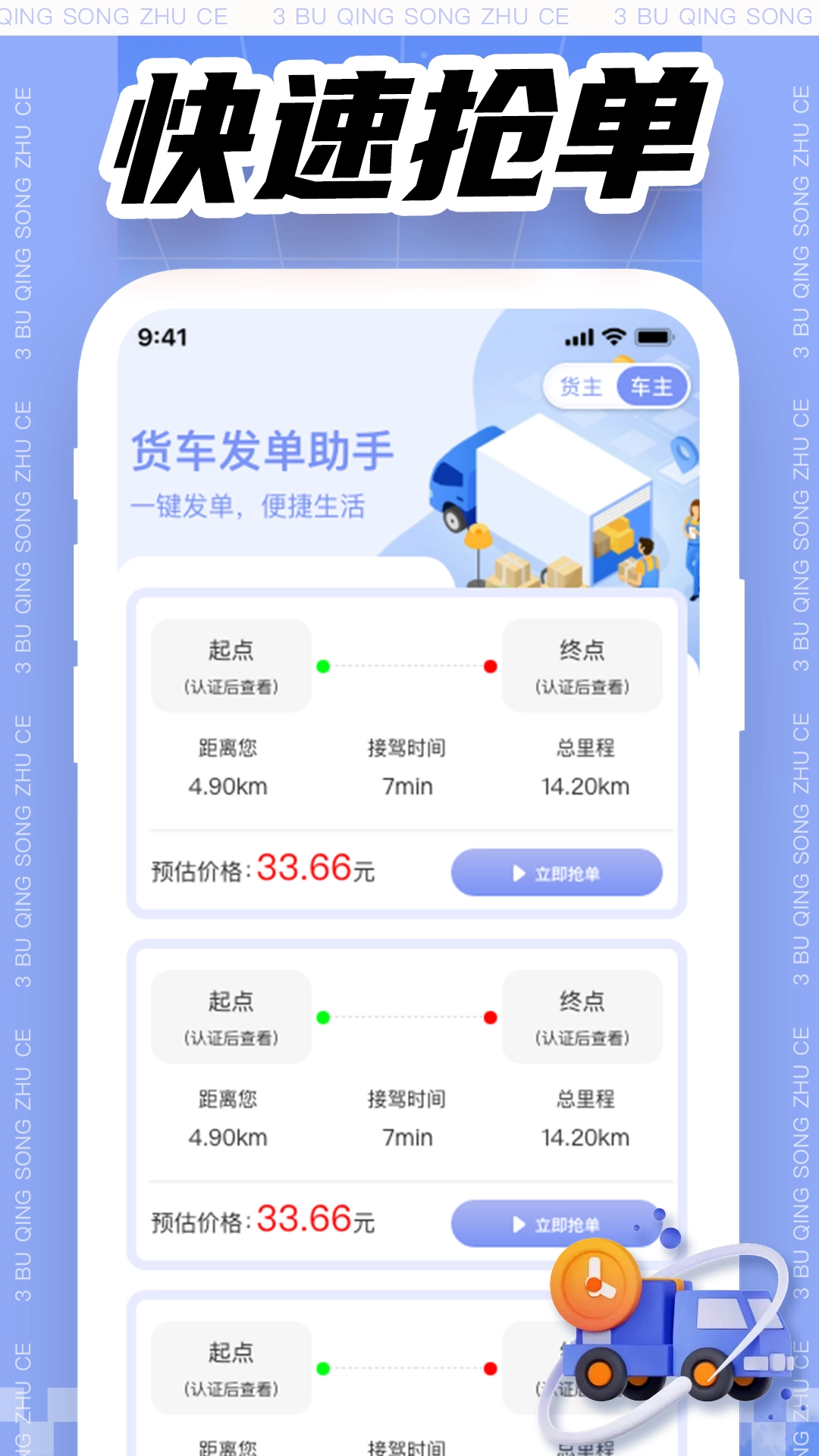 3、货主可在线快速发布搬家订单,填写货物信息、起止地点、车型需求等,简化发单流程。