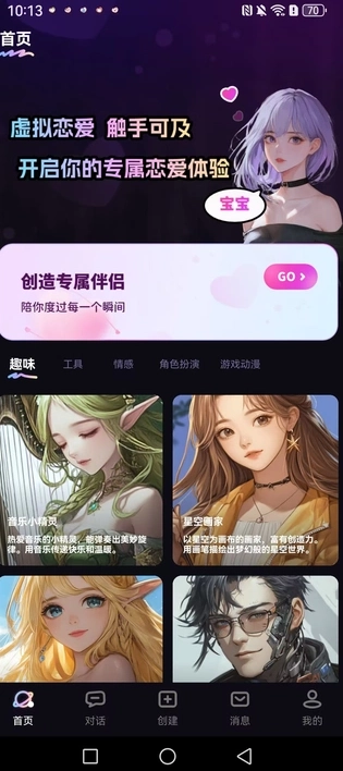 二次元伴侣是一款趣味性十足的虚拟人物在线互动交友软件。在这里,用户能够自行在线创建心仪的聊天对象,还能为对象设定角色扮演,如此一来,便会有众多二次元角色陪伴你畅聊,带你沉浸式体验二次元世界。