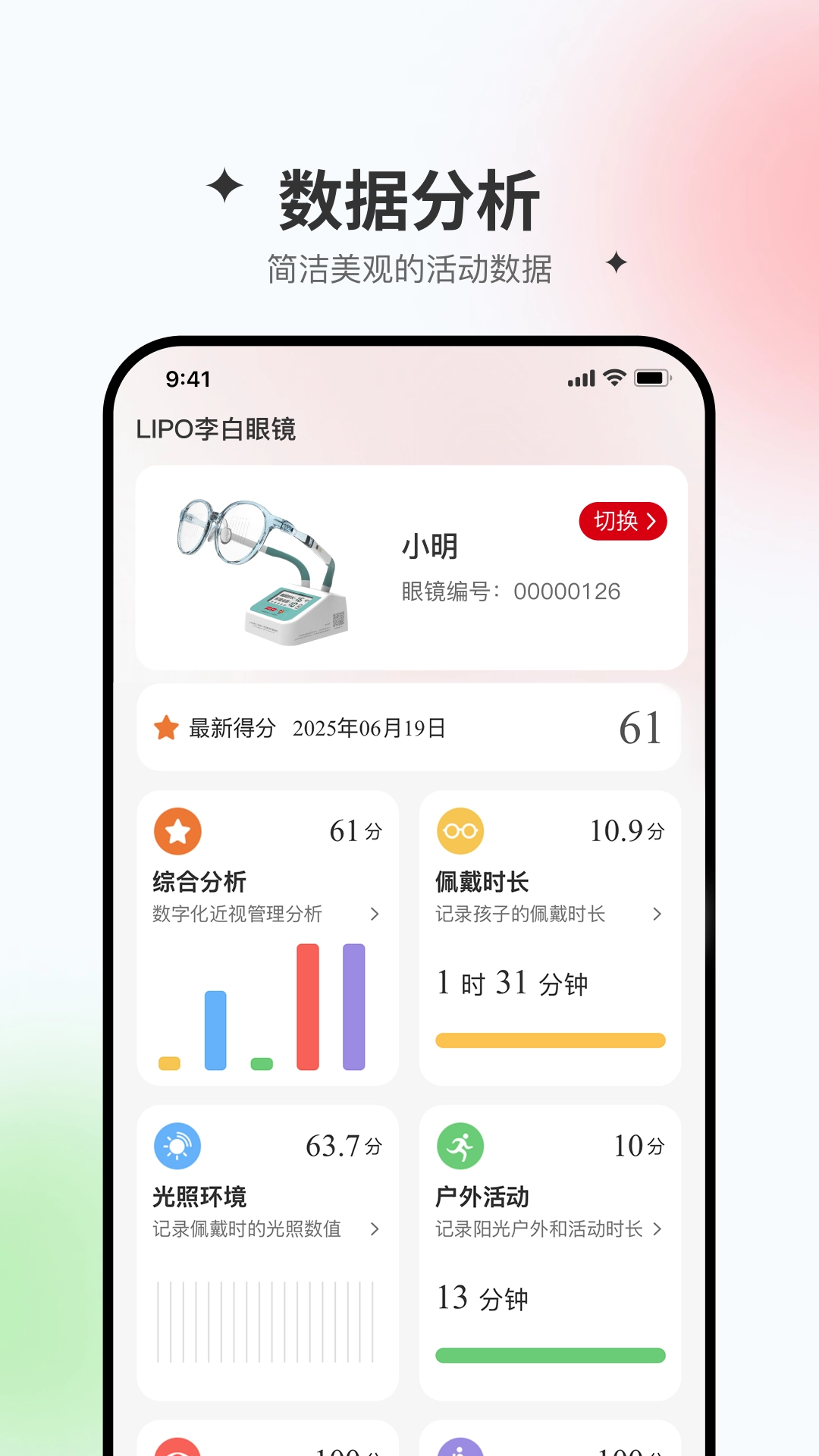 产品搭载6大功能场景:佩戴时长、光照环境、低头用眼、户外活动、坐姿习惯、综合分析。通过这一系列智能化设计,我们致力于将近视管理的过程转化为可视化、数字化的成果展现。孩子的视力守护,是家庭的共同责任。我们期待,在守护孩子明眸的征途中,每一个家庭都能携手并进,为爱出发,共赴光明未来。这,正是我们的理念——“为爱而专业,心与星同行”。LIPO李白星同学,陪你一起看见爱。