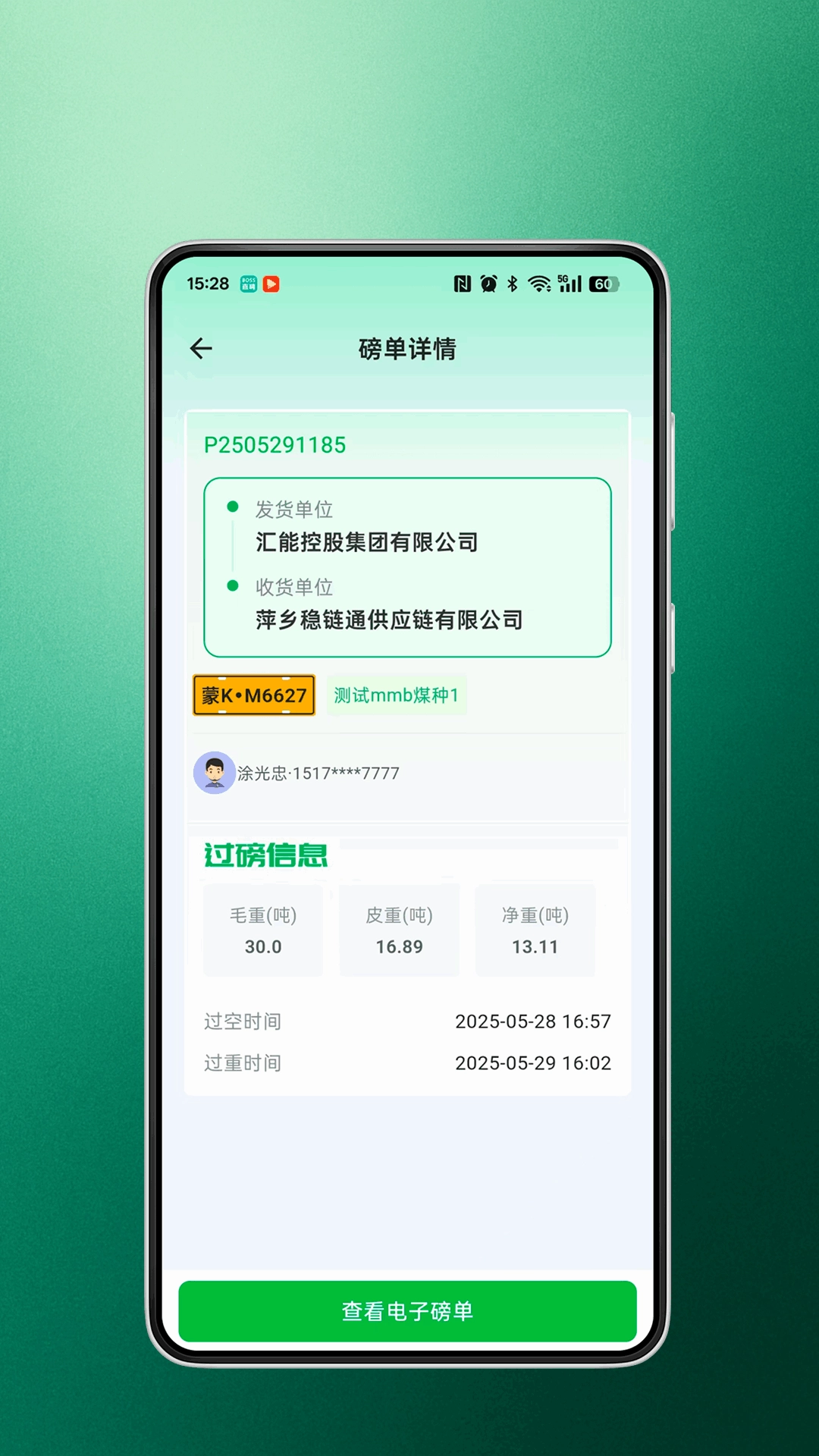 2、在磅单详情页面中可以随时了解过磅的信息,还可以查看电子榜单。