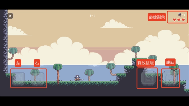 2、左下角为方向控制,帮助你在复杂的地形中灵活移动。右下角分别是技能释放和跳跃按钮,用来躲避障碍和攻击敌人。右上角显示剩余的生命数量,让你随时掌握挑战进度。