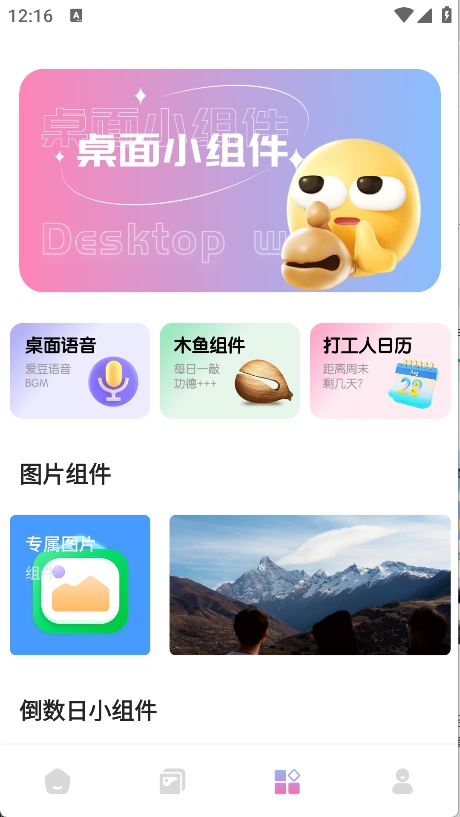 3、在桌面小组件页面中有桌面语音、木鱼组件、打工人日历、图片组件以及倒数日小组件功能。