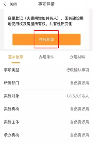 3、选择需要办理的事项,点击在线预审按钮;