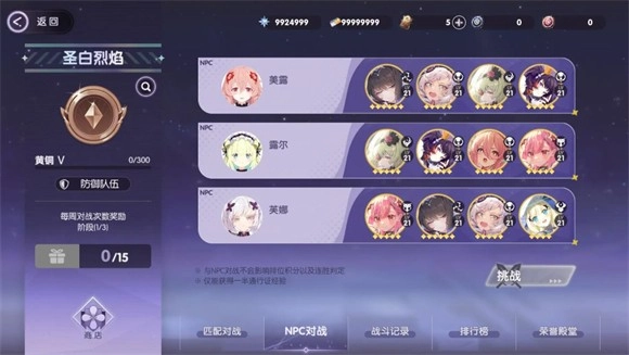 4、“镜界天梯”提供对战玩法,包括玩家间对战与NPC战斗两种模式。玩家对战需预先设定防守阵容,限制为最多四位灵衣角色出战,且不可设定队长或助战角色,阵容中需至少配置一名角色。