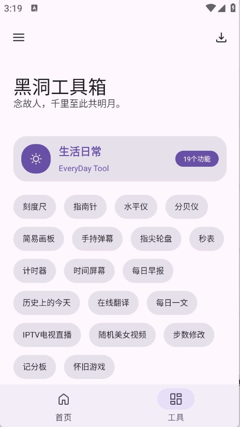 新增以下功能:多平台音乐搜索、指间轮盘、秒表、计时器、二维码生成、圆角图片制作以及华数TV视频解析。