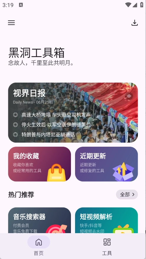 黑洞工具箱App,堪称一座资源丰富的手机软件宝库。这款App内的手机工具琳琅满目,涵盖图片处理、查询搜索、资源提取、文字相关等多种类型。形形色色的实用工具,全部都能免费使用。不仅如此,在这儿,大家还能浏览最新的日报新闻,第一时间掌握最新资讯。别犹豫啦,赶紧行动起来!