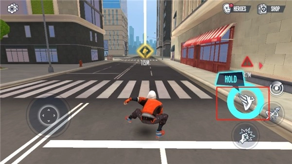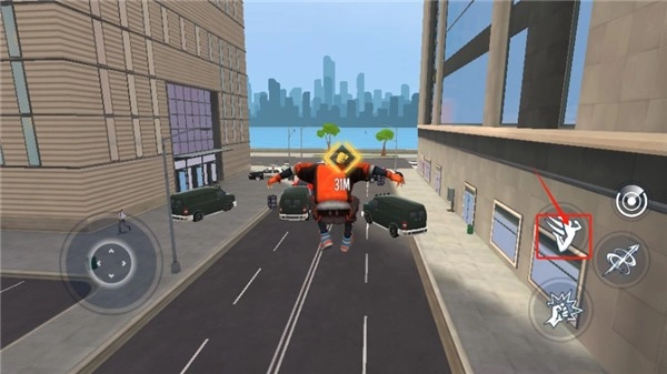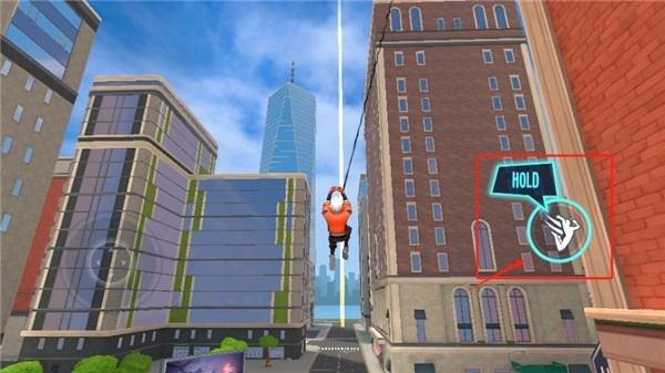 3、按住跳跃按钮,蜘蛛侠会发射蛛丝,快速在城市间穿行,主要用于赶路。