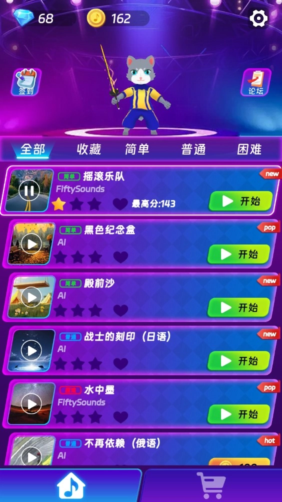 2、每首音乐都配备了多个难度等级,适合新手入门或高手进阶。想要更刺激的节奏挑战?大胆选择高难度关卡,展现你的操作技巧!