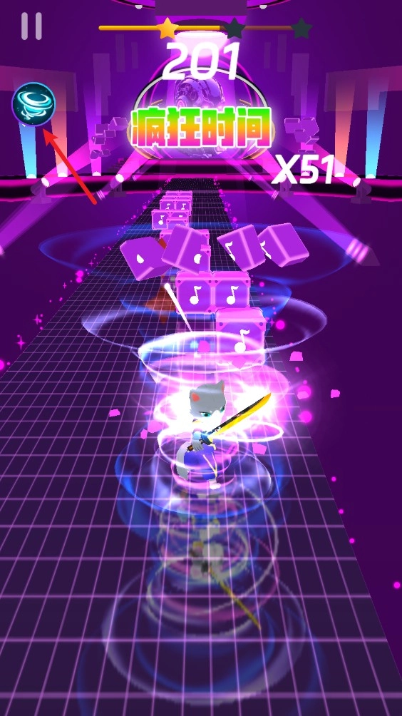 3、游戏正式开始后,玩家只需通过左右滑动屏幕来控制猫咪的移动方向,精准击中沿路出现的音符和敌人。击中越精准,得分越高!