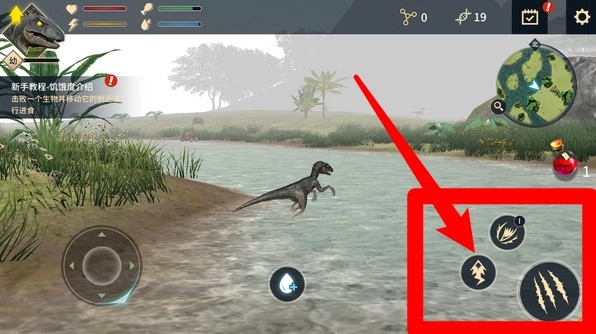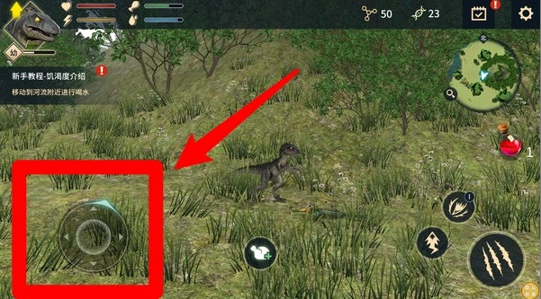 2.使用左下方虚拟摇杆控制恐龙移动,自由探索整片原始地图。