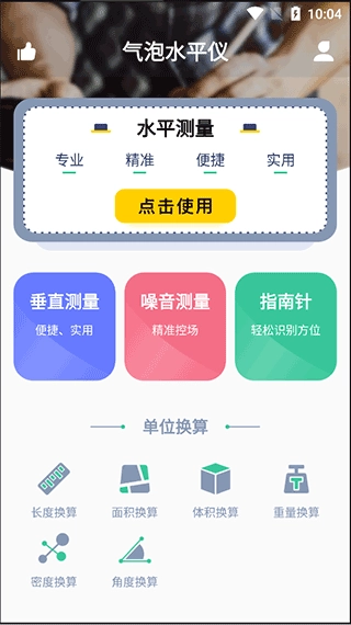 气泡水平仪是生活中可能会用到的测量工具。要是你身边没有精准的测量仪器,却又急需测量水平,那这款软件绝对是你的不二之选。它操作简单轻松,能让你毫不费力地完成测量,是款十分好用的软件,有需要就试试吧!