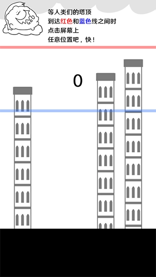 玩家只需点击塔顶,让它停在红蓝线之间就能获得分数。塔建得越高,得分就越多,要是能紧贴红线停下,最高能拿到100分呢。而且蓝线会慢慢往上升,塔的移动速度也会变化,游戏难度会逐渐增加。