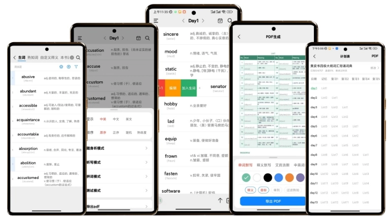 提供市面主流词书单词列表,还具有生词本、熟知词、自定义单词本,通过不同熟练度单词分类收藏,可强化不熟悉单词的记忆,合理规划熟悉单词的复习。
