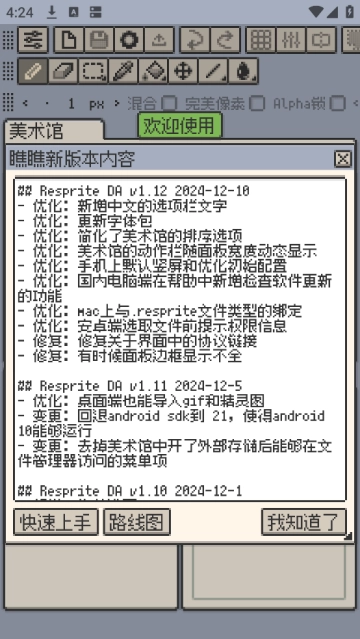 Resprite安卓版是一款超有趣且功能完备的手机工具,能充分满足用户对像素画画的需求。你知道吗?像素也能打造出生活中的艺术。而这款软件就能让你用像素尽情创作,无论何种分辨率的像素作品,它都能助力实现。不仅如此,该软件使用体验极佳,操作更是简单便捷。对了,本站还贴心准备了教程呢。