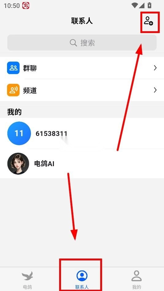 1、打开软件,下方点击联系人,然后点击右侧的“+”号按钮