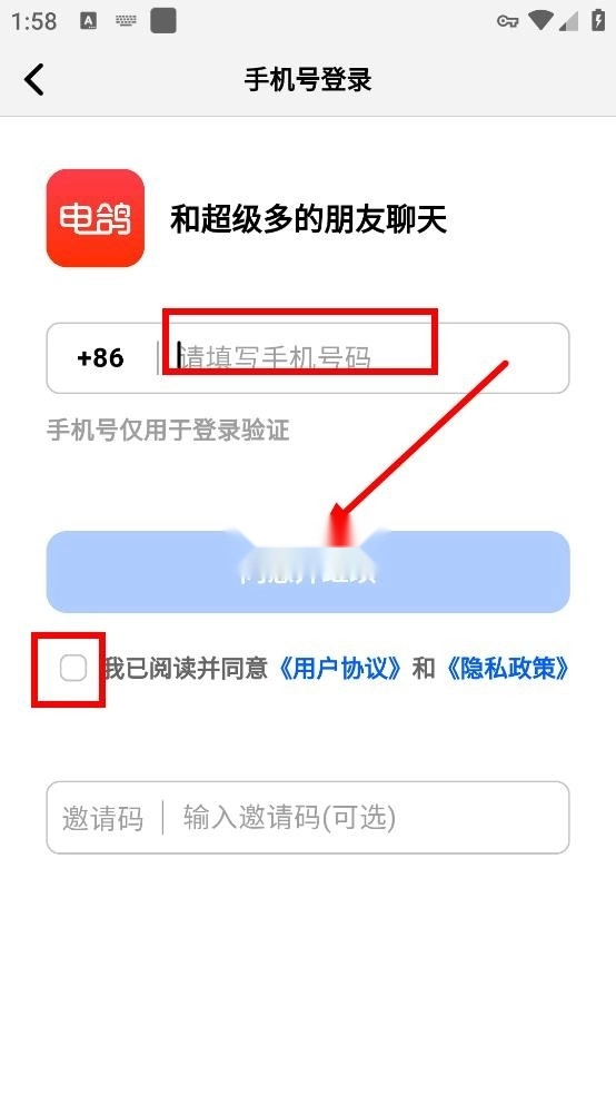 2、输入手机号码,勾选协议,点击同意并继续