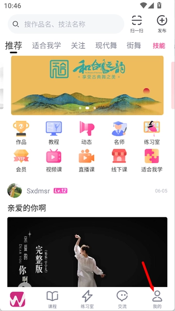 1、打开已安装的中舞网舞蹈神器,在主界面右下角点击“我的”入口,进入个人中心页面。