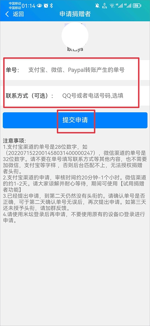 3、然后将转账产生的单号和联系方式填写完成后点击提交申请即可