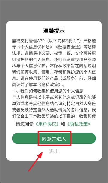 安装并打开鼎教教,在温馨提示界面点击同意并进入