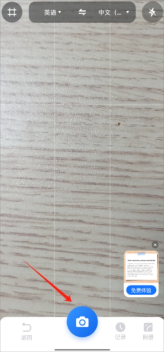 2、在拍照界面,对准待翻译内容,点击底部【相机】按钮拍摄识别。