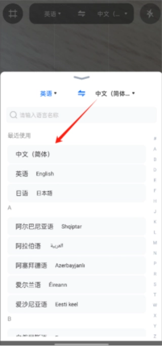 3、于语言选择栏处,选定目标语言,从而完成翻译设置与识别。