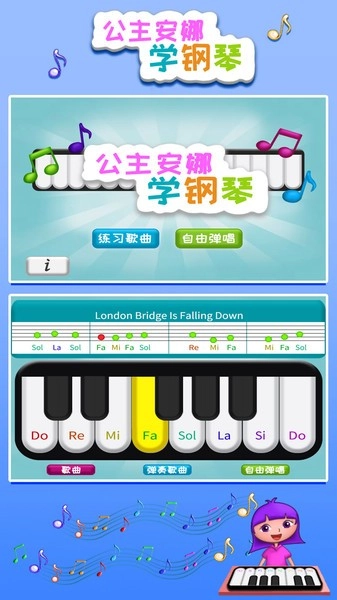 公主安娜学钢琴安卓版是一款适合朋友们上手操作的在线学钢琴游戏。它以娱乐的形式让大家体验弹琴的乐趣,只需点击屏幕就能发出声音,还提供了多种不同的乐谱,是一款值得推荐的育儿小游戏。