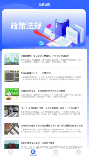 1、进入汽车交通违章查询后,在首页导航栏选择"政策法规"板块,查看最新法规动态。