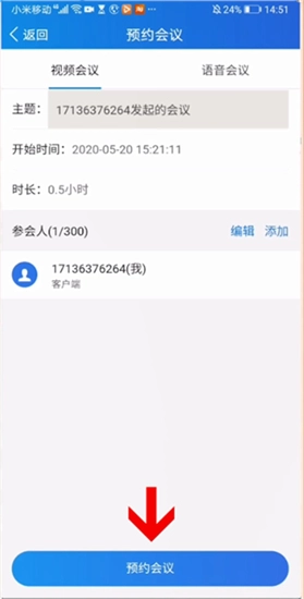 2、然后点击预约会议,选择开始时间,设置会议时长,在参会人列表处点击编辑,添加参会人,最后点击预约会议即可。参会人点击加入会议,输入会议号即可加入会议。