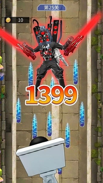 这是一款休闲射击游戏,你要操控电视人左右移动,收集沿途的强化道具。不同的道具能提升各方面能力,助力电视人持续变强,去挑战关卡最后的BOSS!