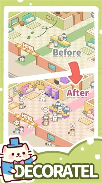 3、丰富的深度模拟经营玩法,你得用心规划与打理专属猫酒店,打造出最惬意的居住氛围并提供贴心服务。