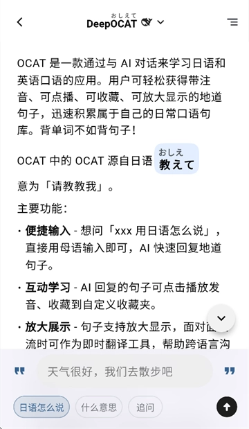 OCAT是一款借助与AI对话形式,助力用户学习日语和英语口语的应用程序。使用者能够便捷获取带有注音、支持播放、可以收藏以及能够放大显示的地道语句,快速构建起属于自己的日常口语句子储备库。