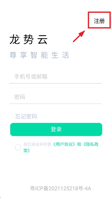 安装并打开龙势云,进入登录界面后,勾选我已阅读并同意 《用户协议》和 《隐私政策》,点击注册