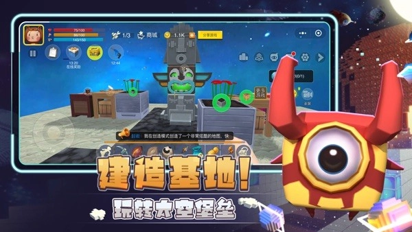 在生存模式里,抓取太空中的爆炸漂浮物来对抗饥饿和缺氧。在有限的氧气中,高效收集物资,进行无限地创造!也可以使用抓取的物品制作各种道具和建筑,组建自己的领地,当面对萌眼星生物来犯时,需穿上装备和武器,攻击它们!