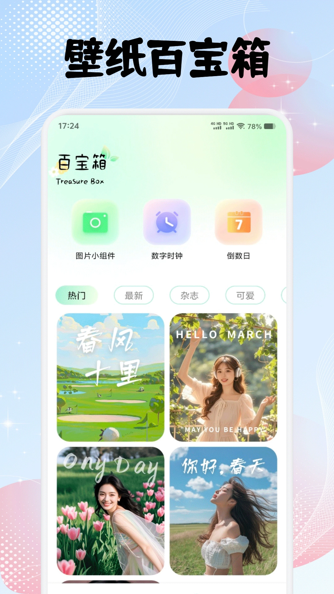 3、壁纸百宝箱,内含图片小组件、数字时钟等实用工具,提升桌面实用性。