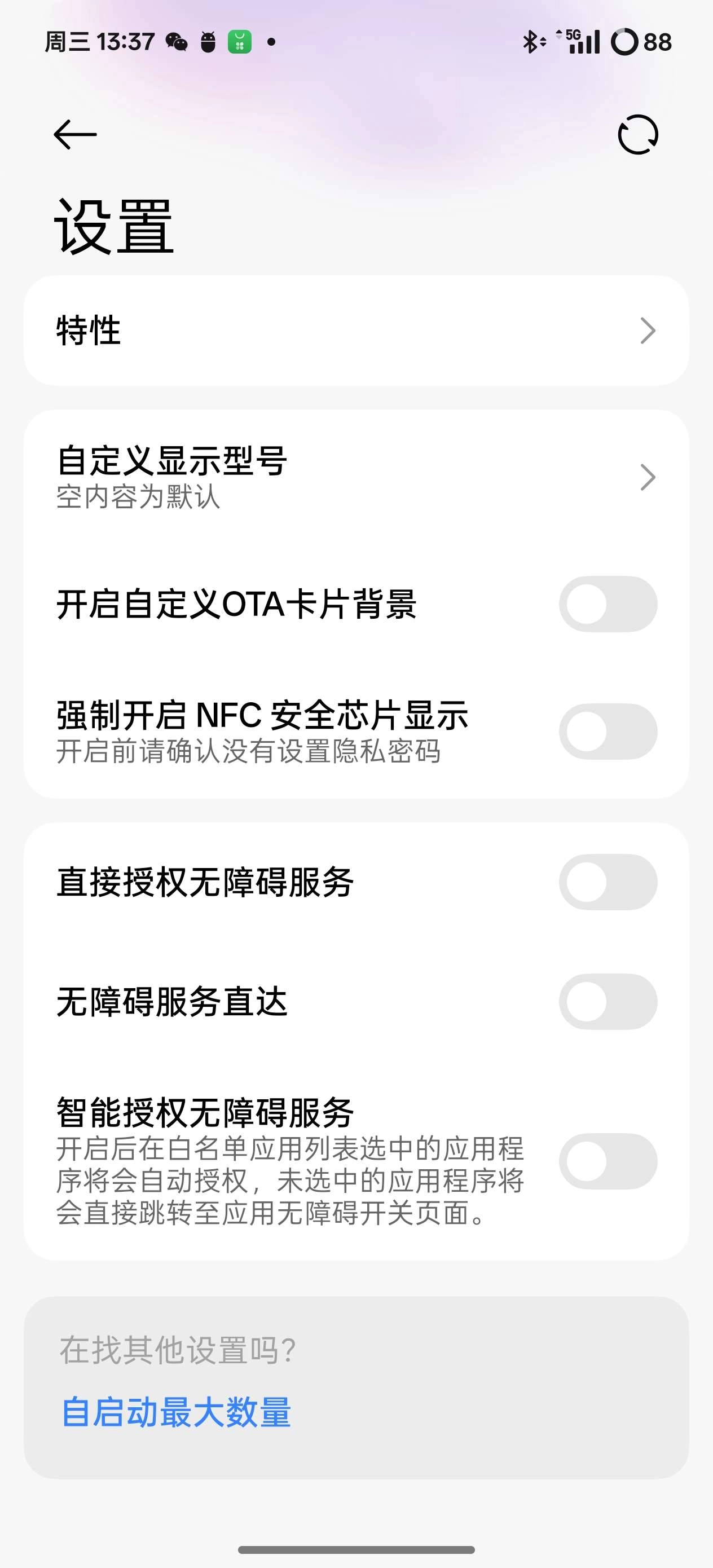 4.进入设置页面,支持查看设备特性,还可自定义显示型号、开启自定义OTA卡片背景等
