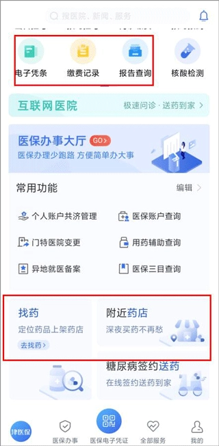 1. 开启津医保,其界面设有首页、医保办事、医保电子凭证、全部服务以及我的板块。