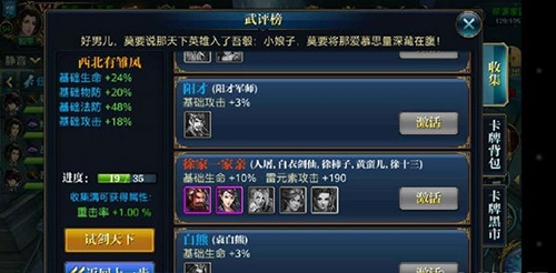 卡牌:卡牌可以通过试剑天下获得V6以上可以刷新,建议每次刷新到紫色以上在打。但是需要的金子多了就别刷新了~银子和金子充足的就去江湖游学获得。卡牌黑市有急需的可以购买