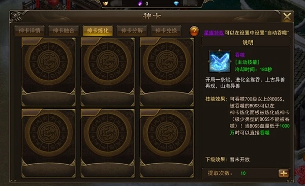 首先就有霸者大陆勇士要问了,如何将BOSS化为神卡呢?这里需要的一个特殊的技能“吞噬”,在将怪物打致残血(低于1000万)时,使用本技能消灭BOSS,就可以成功地将其吞噬了。至于本技能,在开启神卡系统的时候就会获得,记得把它添加到技能栏,适时地使用哦~700级以上的BOSS可以被吞噬,吞噬之后还需要将其进行进一步的炼化,才能成为一张神卡。